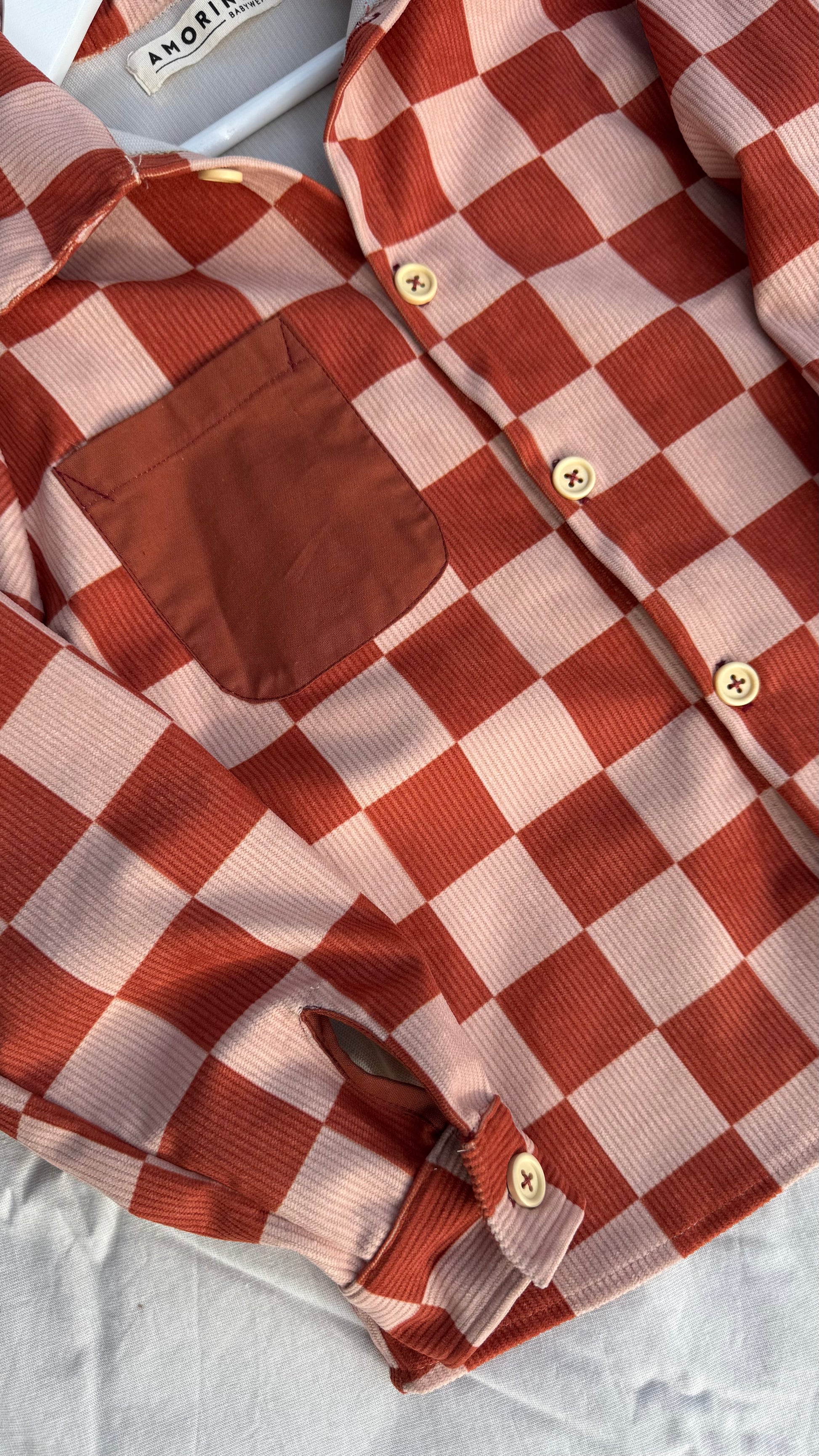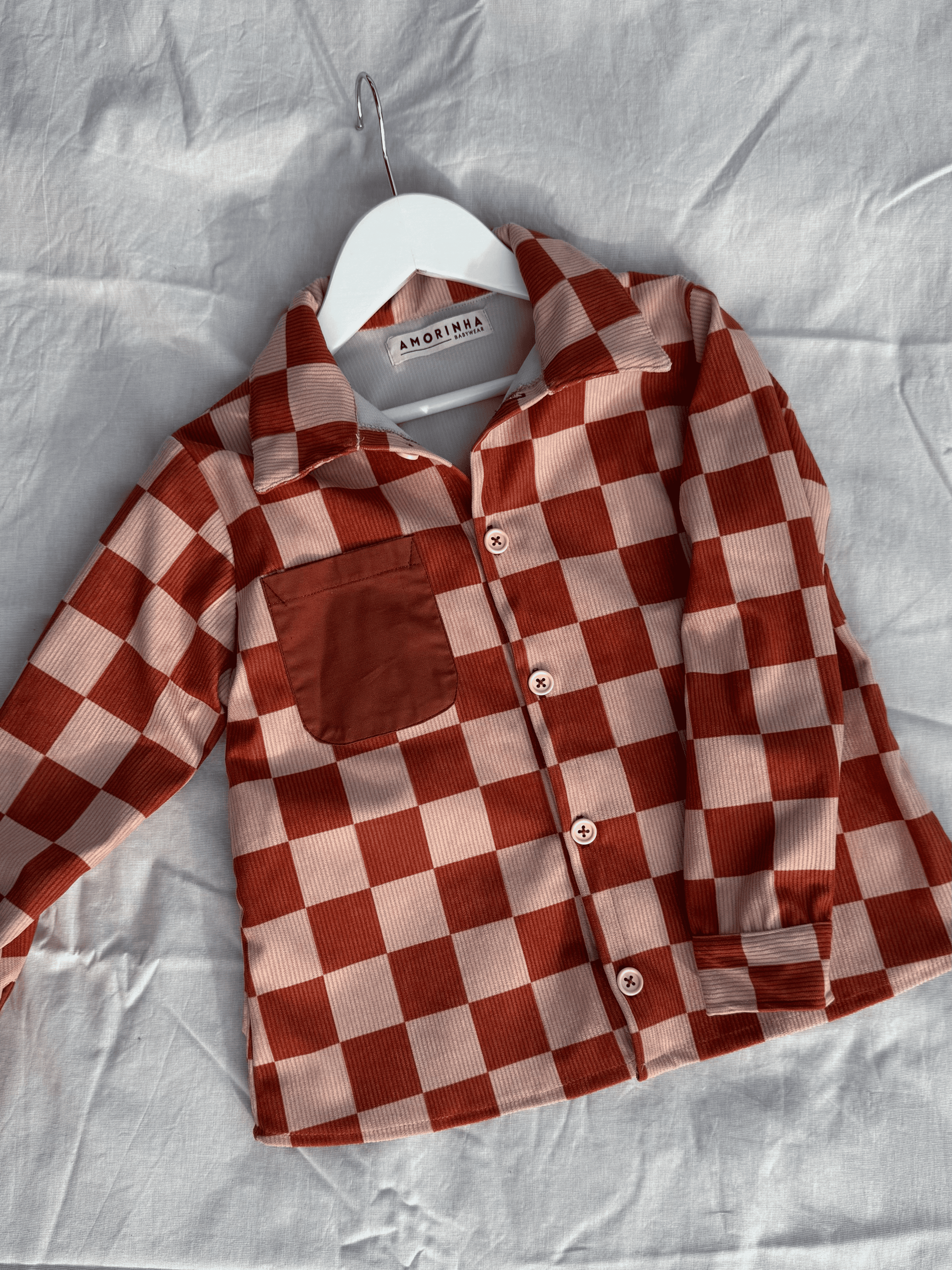 Camisa em bombazine com xadrez terracota, detalhes cuidados, cheia de estilo para os mais pequenos. Uma peça versátil e e que garante conforto desde os 0 meses até aos 12 anos.