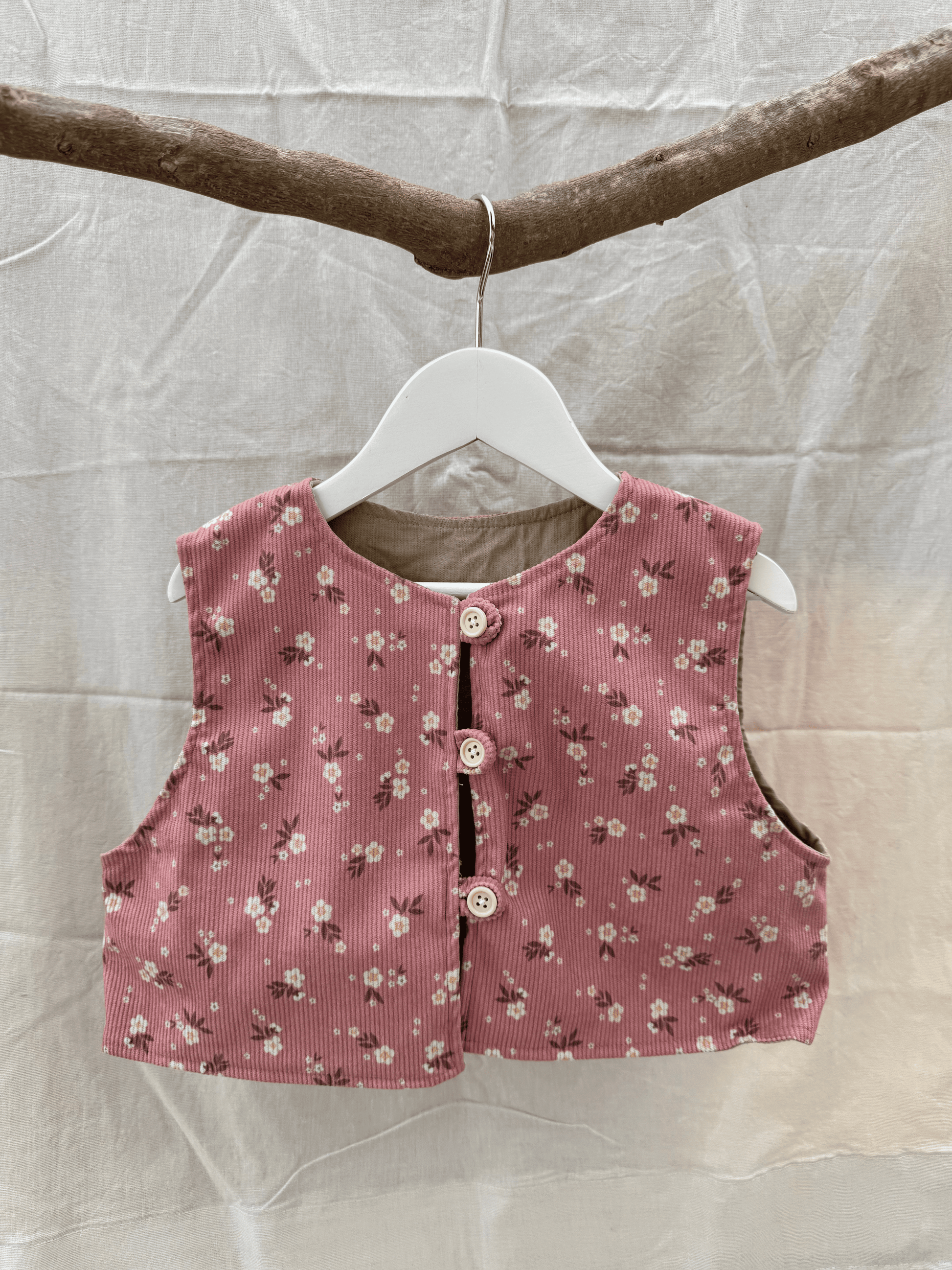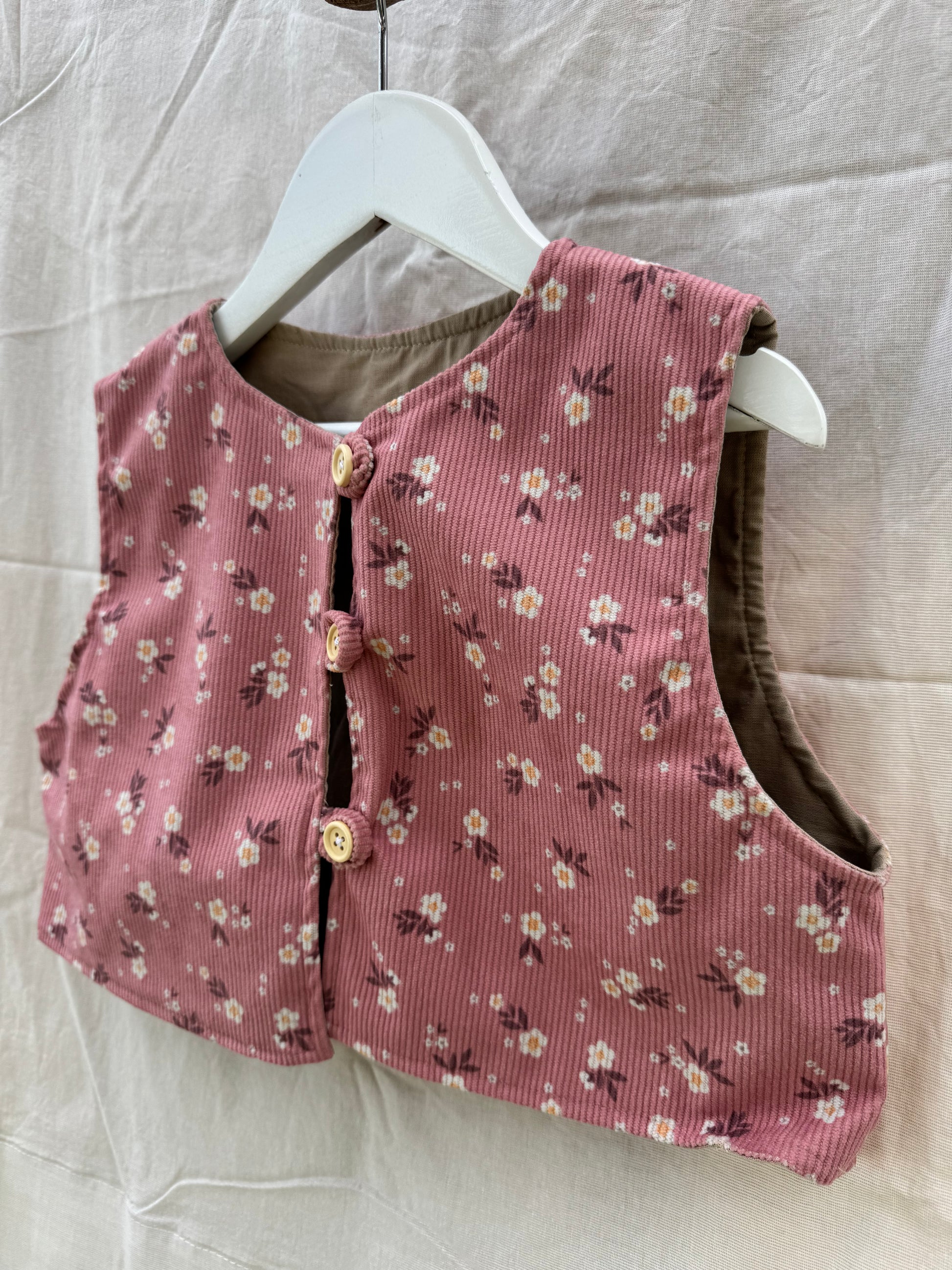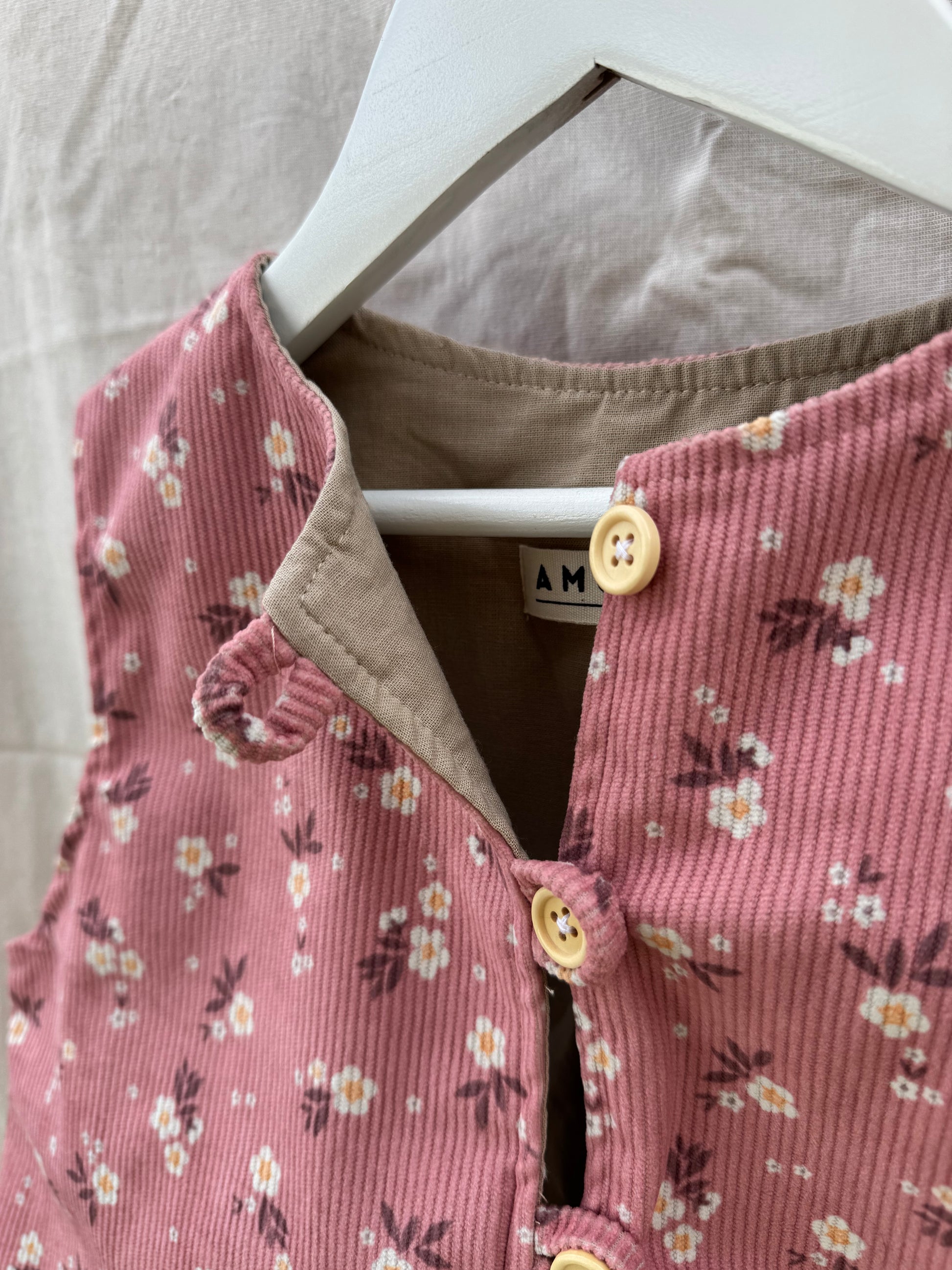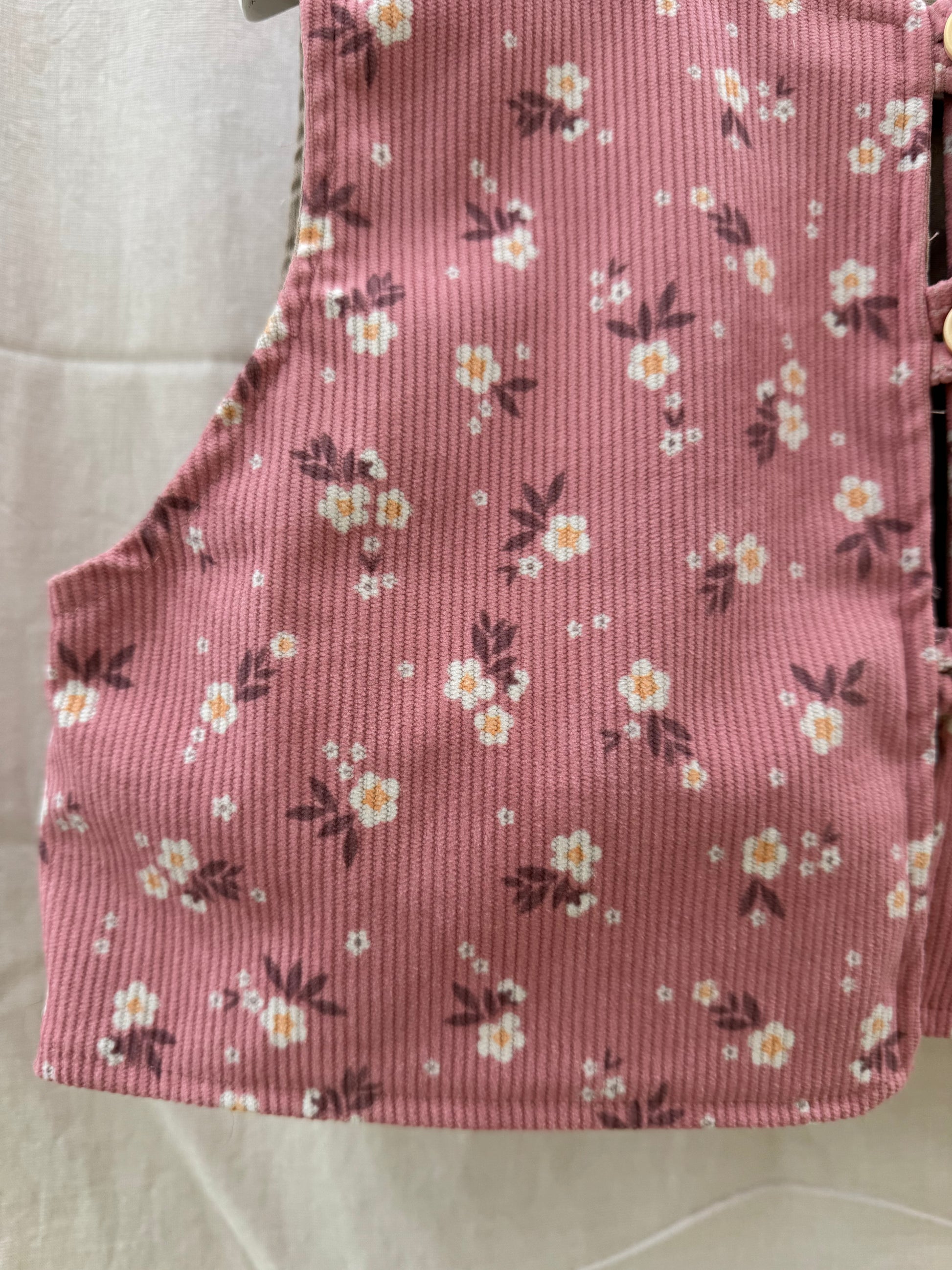 Colete leve em bombazine e forro de algodão com padrão floral, botões em madeira e toque aconchegante. Delicado, confortável e perfeito para completar qualquer look desde os 0 meses aos 12 anos.