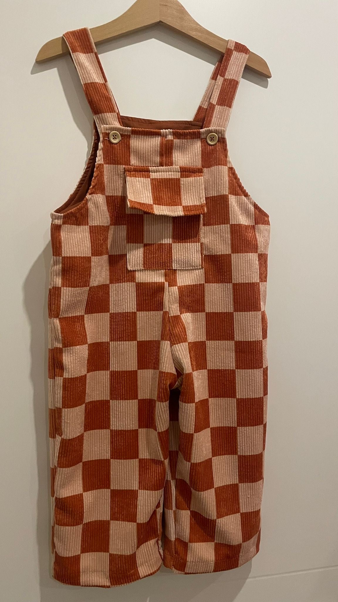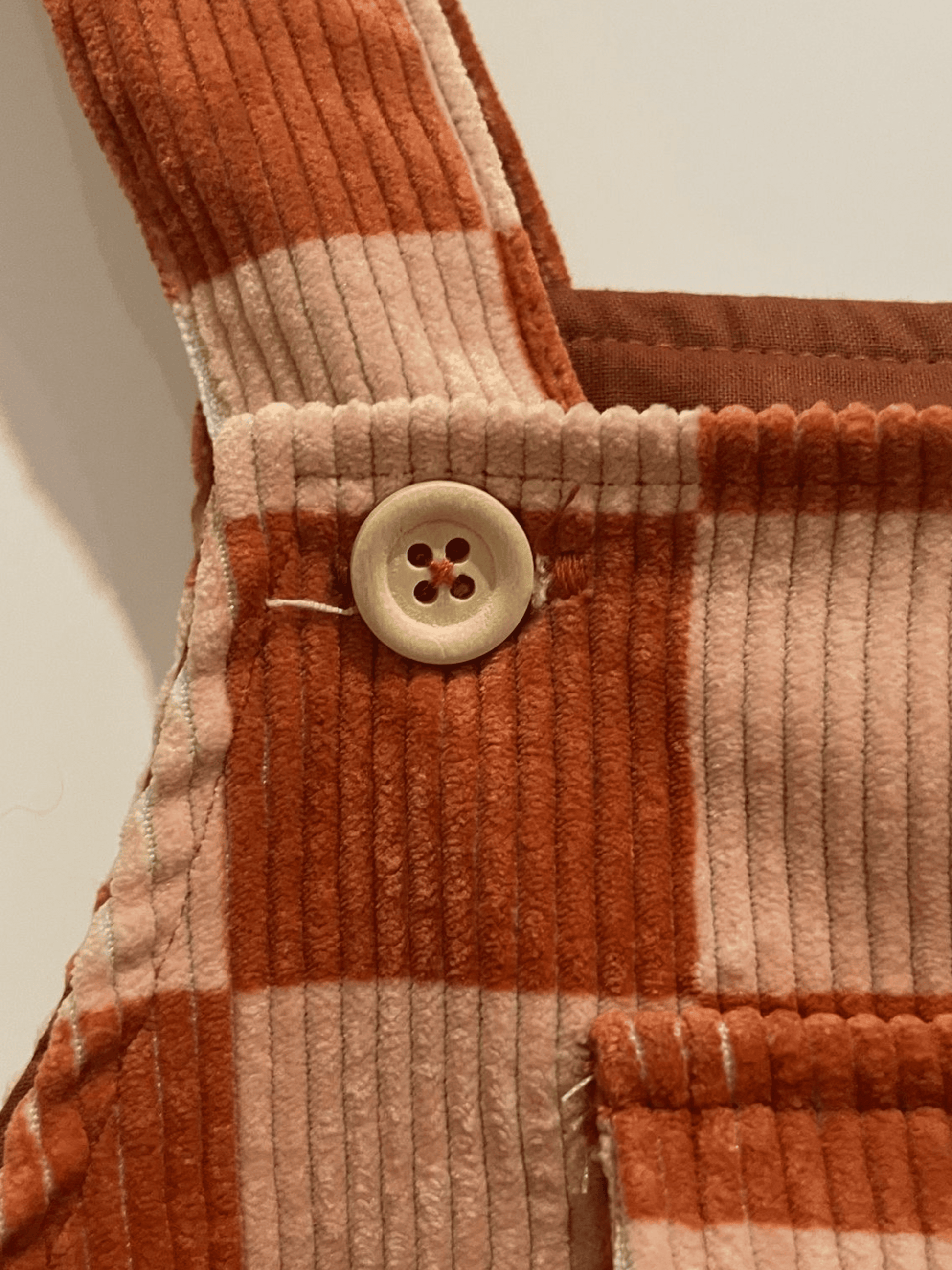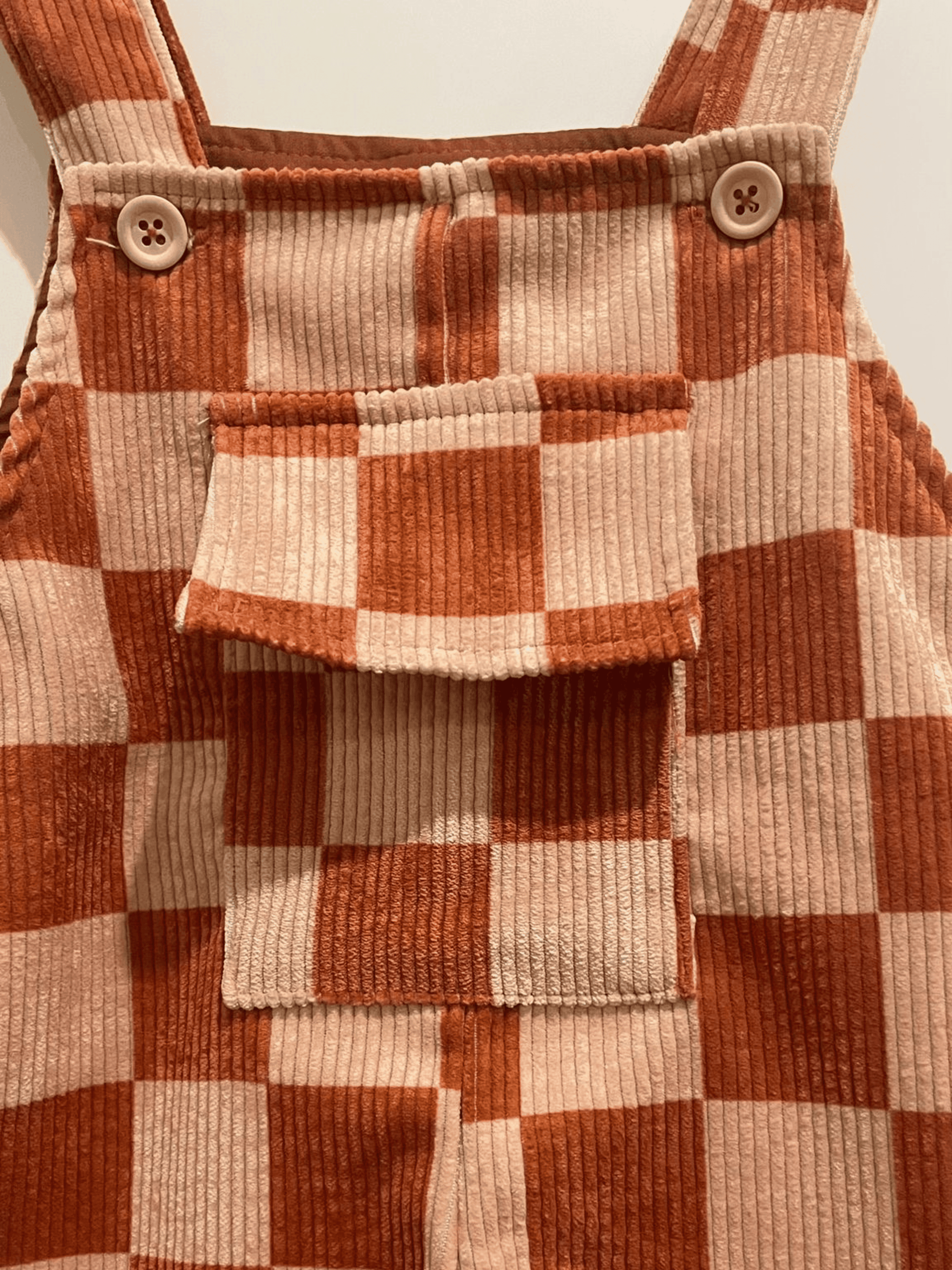 Jardineiras em bombazine xadrez terracota, confortáveis e delicadas.
